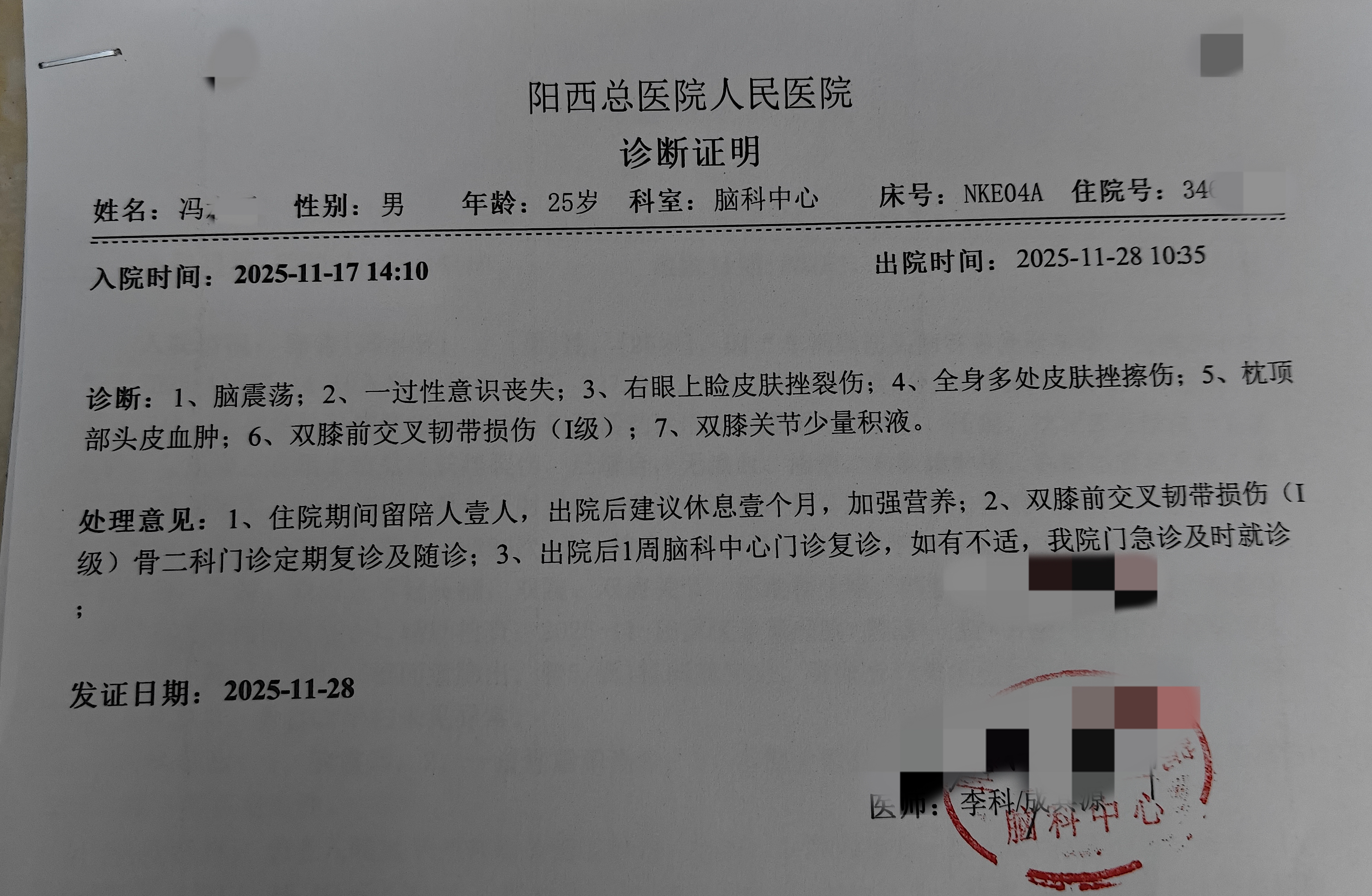事故当日,冯先生被送往医院接受治疗,11月28日出院。医院的诊断证明显示,事故导致冯先生脑震荡、全身多处皮肤擦挫伤等。“我的货车报废了,治疗一共花费了9000多元,都是自己垫付的。住院期间联系了安行宝公司,才发觉买的是共享修车服务。而对方一直找借口拒绝理赔,11月26日起,和我对接的工作人员就没有回复任何消息了。”